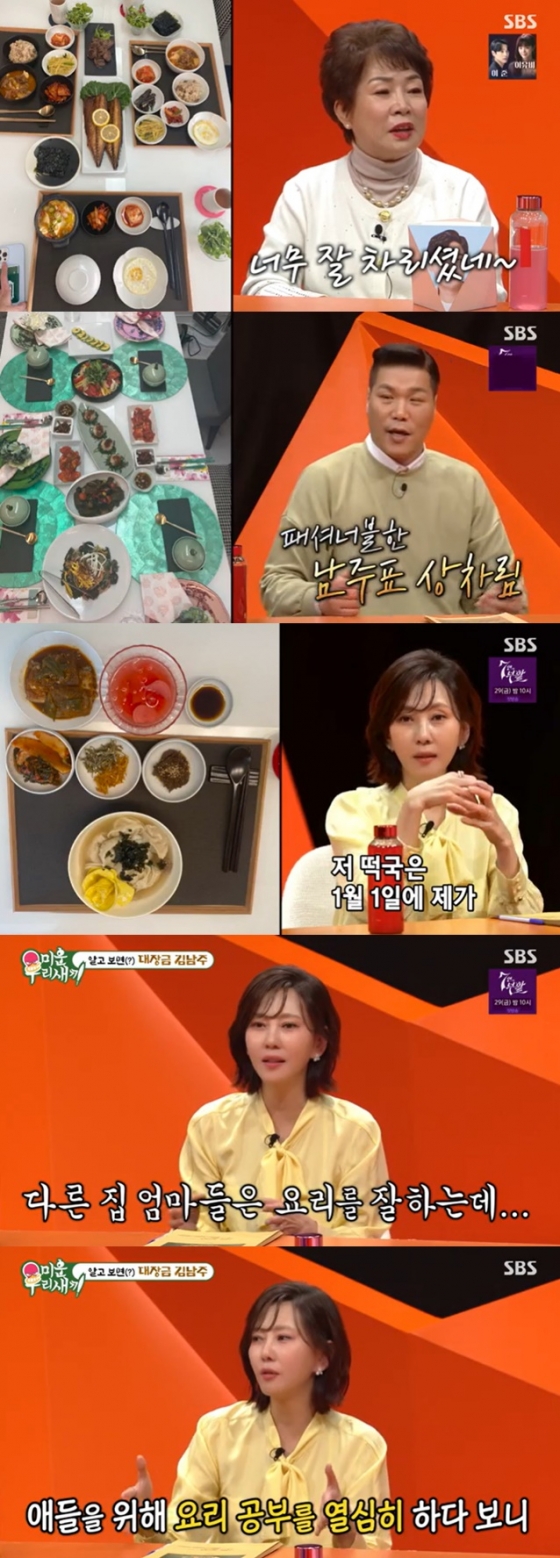 신동엽은 "예전에 어떤 인터뷰에서 (김승우가) '내 아내 김남주가 요리를 아예 못 했는데 이제 대장금이다'라고 한 적이 있다"고 했고, 김남주가 차린 다양한 한식 요리 사진이 공개됐다. 김남주는 "떡국은 1월 1일날 꽃모양 지단을 만들어서 남편 떡국을 끓여줬다"라며 "원래는 요리에 관심도 없고 할 줄도 몰랐는데 아이들이 크면서 다른 집 아이들이 너무 잘 얻어먹는 걸 보고 제가 샘이 많아서 '우리 애들도 해먹일 거야'라면서 요리 클래스를 많이 다녔다"라고 밝혔다.