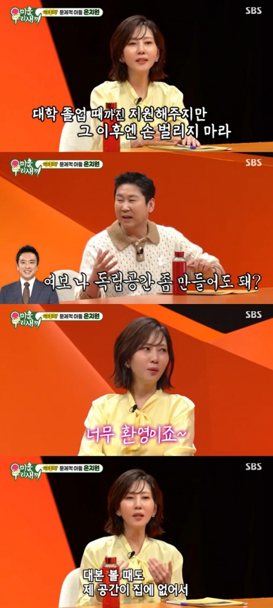 이날 은지원이 '미우새'에 합류, 자신만의 게임 아지트를 만드는 모습을 공개했다. 이를 본 서장훈이 "만약에 김남주 씨 아들이 성인이 돼서 자기만의 아지트를 만들겠다고 하면 어떻게 하겠냐"라고 물었고, 김남주는 "자기가 벌어서 하면 아무 문제 없다. 돈을 달라고 하면 안 된다. 저 애들한테 '대학 졸업 때까지만 지원할 것이다. 그 이후엔 나한테 손 벌리지 마라'라고 했다"고 전했다.