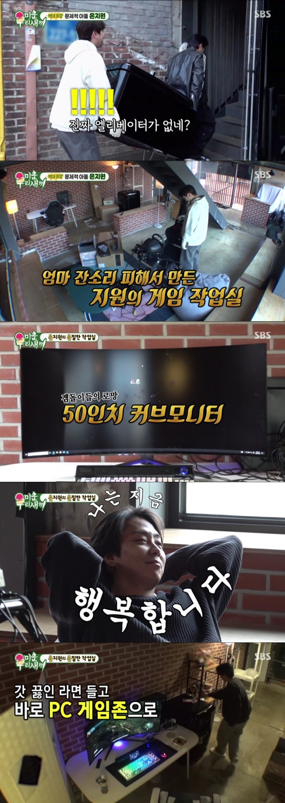 드디어 게임 장비로 세팅된 은지원의 작업실이 공개됐고, 매니저는 "작업실이 맞는 거죠?"라며 좀처럼 믿지 못했다. 은지원은 "집에 두면 엄마가 잔소리하시니까 눈치 보인다"며 작업실을 얻게 된 이유를 수줍게 고백했다. 게임에 최적화된 50인치 커브 모니터와 게임 전용 키보드 등 초호화 게임 장비를 신나서 설명하는 은지원의 모습을 지켜보던 혜진 母는 "맨날 초등학생 같아"라며 일침을 날려 폭소를 자아냈다. 승수 母 역시 "저렇게 사니까 동안인가 보다"라고 거들어 웃음을 자아냈다.