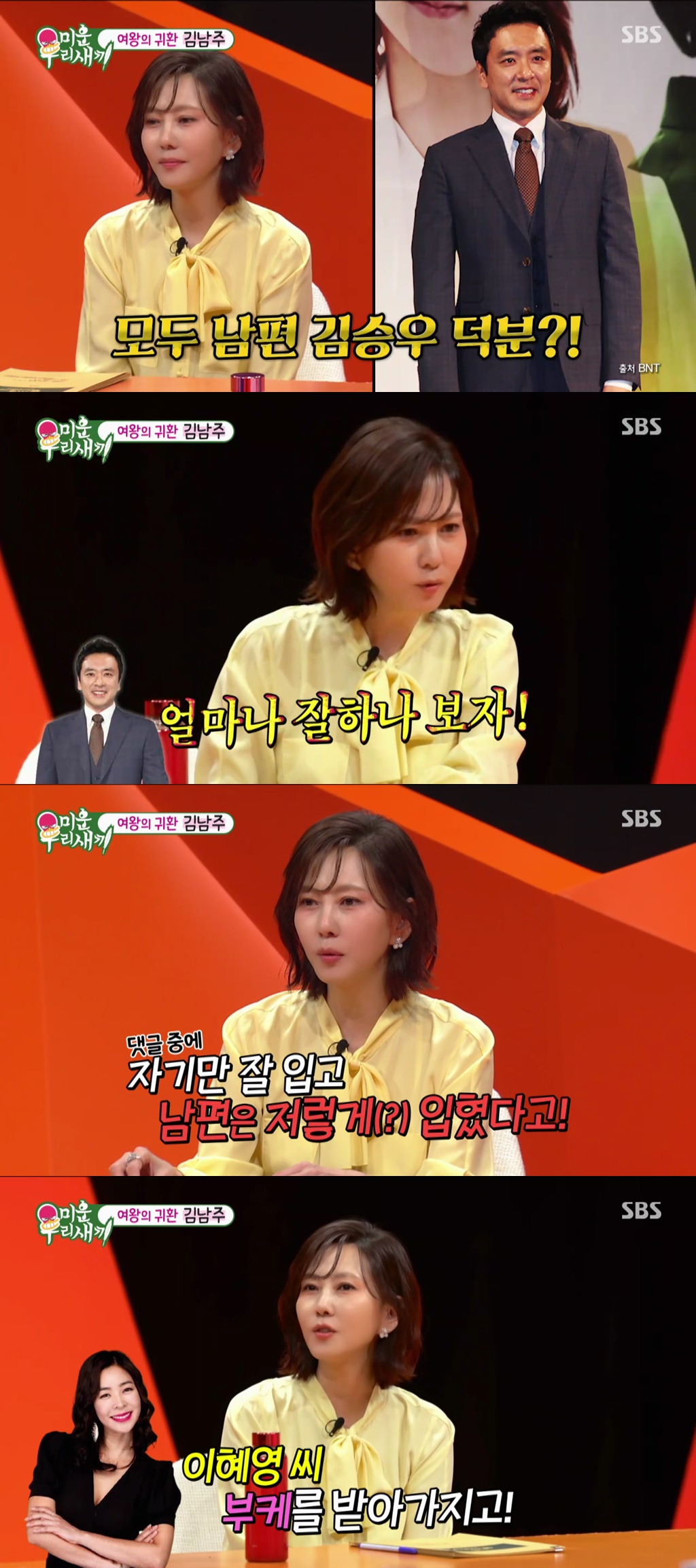 이날 스튜디오에는 배우 김남주가 스페셜 MC로 등장해 母벤져스의 열렬한 환영을 받았다. 무려 25년 만에 SBS를 찾았다는 김남주는 출연한 작품마다 흥행하는 이유를 묻는 질문에 "아이들 엄마다 보니 대본이 들어오면 잘 안 읽는다. 남편 김승우 씨가 대본을 읽어보고 추천해서 '미스티'도, '원더풀 라이프'도 하게 됐다"라고 밝혔다. 김남주는 "이번 드라마 촬영 때도 제가 우는 씬이 있는데 김승우 씨가 촬영장에 찾아와 모니터링을 하더라. '얼마나 잘하나 보자'하는 태도라 (남편을) 모른 척할 수밖에 없었다"라고 밝혀 웃음을 자아냈다.