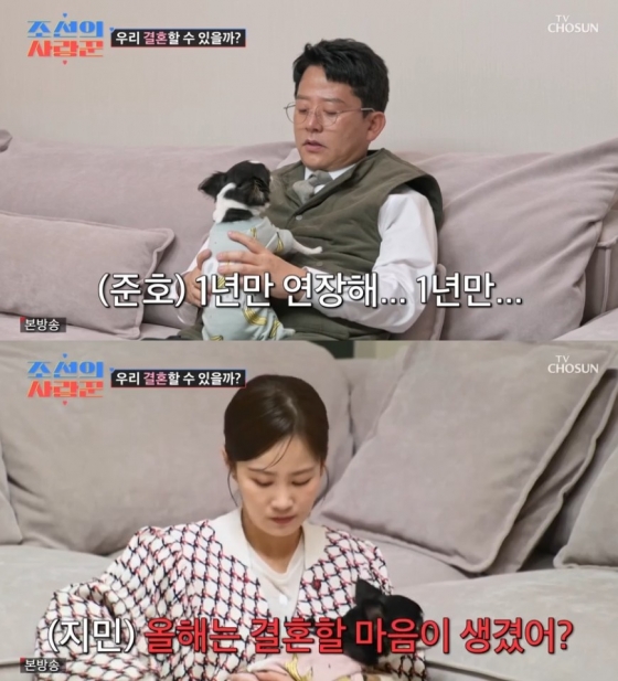 이에 김준호는 "(결혼은) 인륜지대사잖아. (김)지민이도 결심이 서야 하고, 나도 결심이 서서 느낌이 오면 프러포즈를 하고 결혼을 진행하는 건데, 사실 나도 모르는 거다"라며 신중한 태도를 취했다. 그러자 김지민은 "합칠거면 '집을 알아봐야 하나. 말아야 하나'하던 찰나에 재계약을 하고 와서 나에게 통보하는 느낌이 좀 그랬다"고 털어놨고, 김준호는 "(계약 연장) 하지 말까. 아직 안했다"고 말했다.