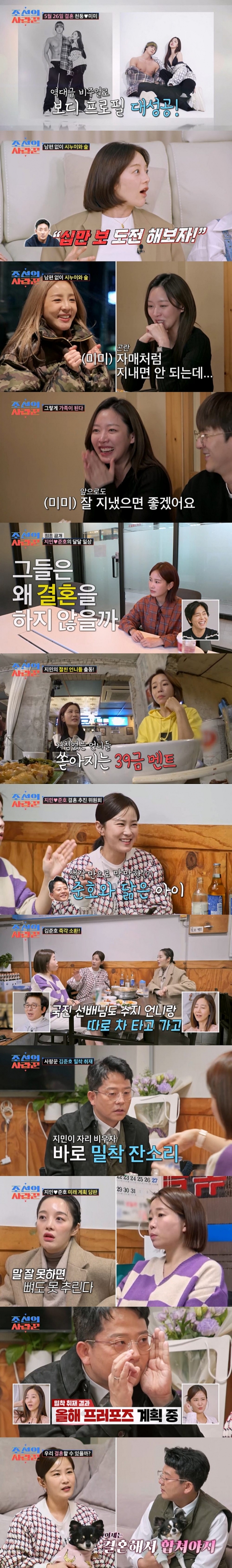 VCR에서 김지민은 '소울메이트' 황보라X정이랑과 단골 식당에서 오랜만에 회포를 풀었다. 김지민은 "최성국 오빠 영상을 보고 처음으로 아기를 낳고 싶다는 생각이 들었다"면서도 "사실은 막막하다. 김준호의 한량 같고, 퍼주는 그런 성격 닮을까 봐…난 한 명으로 족하다"고 가감 없는 솔직 발언으로 웃음을 선사했다. 하지만 결혼 얘기에 진전이 없는 둘을 보며 '유부클럽' 황보라X정이랑은 답답함을 토로했다. 황보라는 "준호 선배가 너무 무책임한 거 아니냐"고 열변을 토했다. 이에 김지민은 "얼마 전에 (김준호가) 신점 봤다는데, 가을에 결혼 운이 있고 애가 둘일 거라 했다"고 소식을 전하며 "결혼을 한다면 난 무조건 봄, 4월에 하고 싶다"고 소망을 드러냈다.