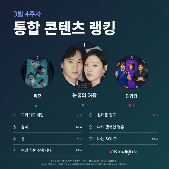 배우 김수현과 김지원 주연의 '눈물의 여왕'이 '파묘'와 '닭강정'을 꺾고 통합 콘텐츠 랭킹 1위를 차지했다.