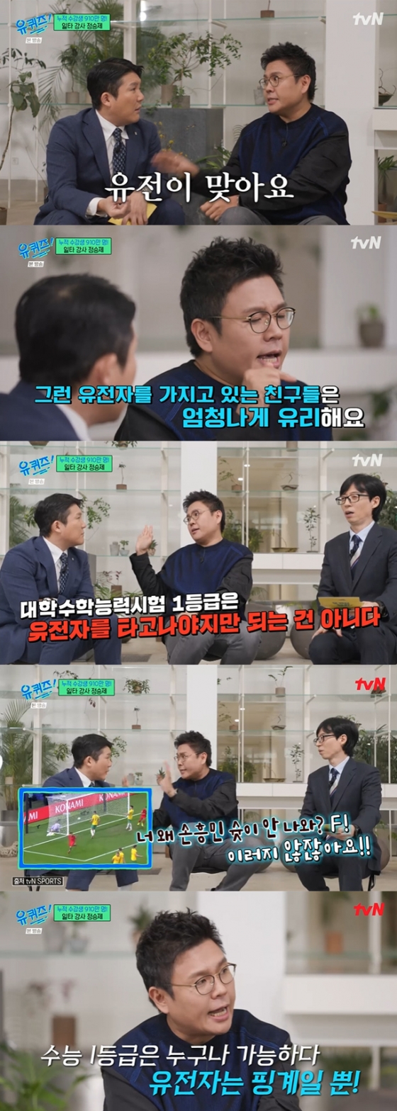 이날 MC 조세호는 정승제에게 공부의 유전적 영향에 대해 물었다. 정승제는 "유전자를 갖고 있는 친구들은 엄청나게 유리하다"라고 답했다. 그러나 "대학수학능력 시험 1등급은 유전자를 타고나야지만 되는 건 아니다. 수능이 손흥민 급을 원하는 게 아니다. 손흥민 같은 슛이 안 나온다고 서 F를 주지 않는다"라고 주장했다. 그러면서 "수능 1등급은 누구나 가능하다. 유전자는 핑계일 뿐"라고 덧붙였다.