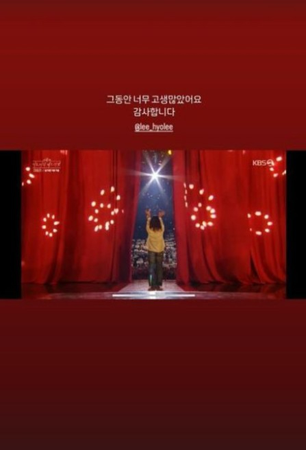 이효리는 30일 개인 SNS를 통해 "그동안 너무 고생많았어요. 감사합니다"라는 글과 함께 한 장의 사진을 공개했다. 한 지인이 올린 게시물을 자신의 계정에 공유한 것.