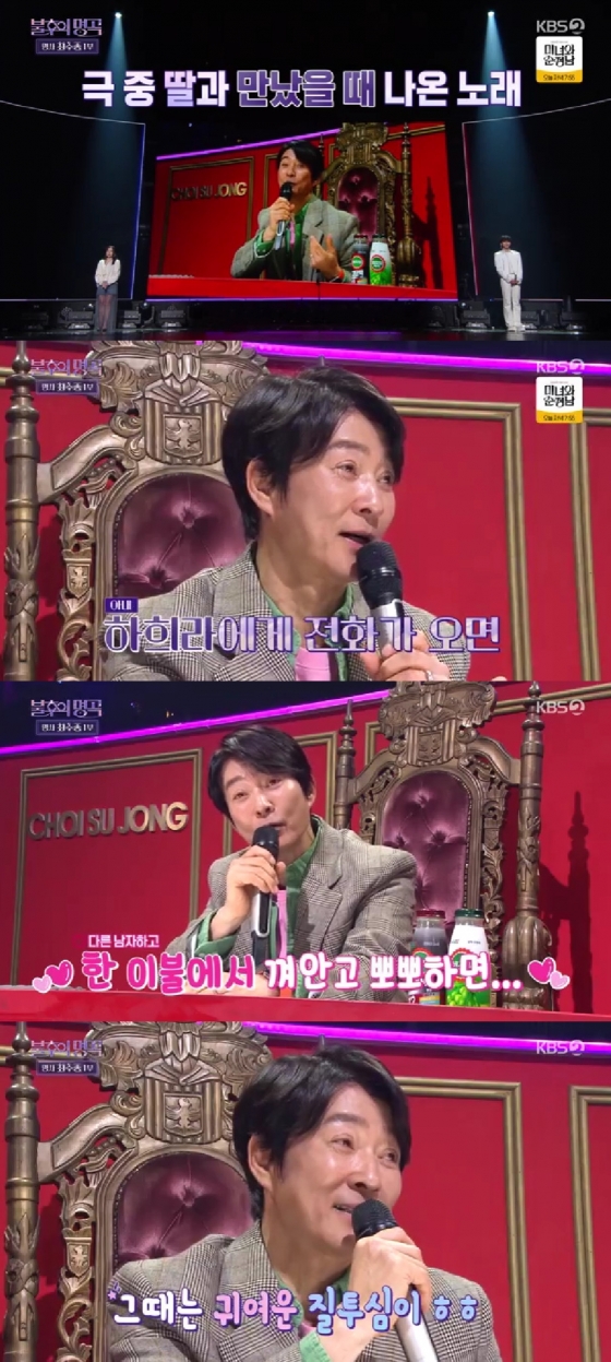 이어 "제 컬러링도 이 노래다. 하희라 씨에게 전화가 오면 이름이 뜨는데 노래를 들으라고 늦게 받는다. 천 번을 다시 태어나도 당신을 택하고, 내 삶에 힘이 되어주는 게 당신이라고 자꾸 들려준다"고 밝혔다.