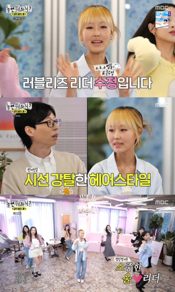 봄처럼 화사한 금발 헤어스타일로 등장한 이수정은 "러블리즈 리더 수정입니다"라고 활기찬 인사를 전했다. "각자의 삶을 살며 러블리즈 생각이 날 때가 있냐"라는 MC 유재석의 질문에 "봄이 오니까 요즘따라 더 많이 나는 것 같다. 제가 다니는 헬스장에도 저희 노래가 유난히 많이 나온다"라고 답했다.