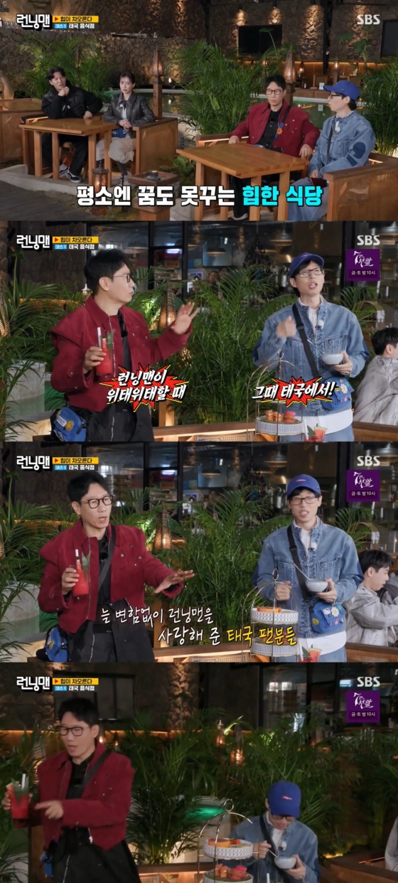멤버들은 배를 타고 입장하며 '리틀 방콕'으로 유명한 레스토랑을 찾았다. 이들은 "해외 촬영 느낌이다. '런닝맨' 해외 촬영"이라며 들뜬 모습을 보였다.