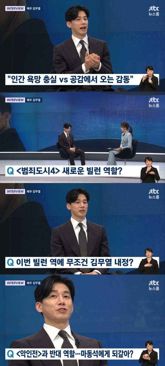 31일 방송된 JTBC '뉴스룸'에는 영화 '범죄도시4'에 출연하는 김무열이 게스트로 출연했다.