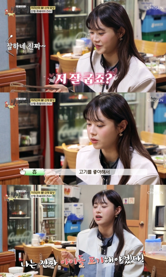 흑돼지를 굽기 시작한 츄는 "난 껍질이 있는 오겹살 느낌을 좋아한다. 완벽하게 껍질도 있고 두께도 그렇다"라며 "고기를 좋아해서 진짜 아이돌 포기해야 하겠다고 생각했다"라고 털어놨다.