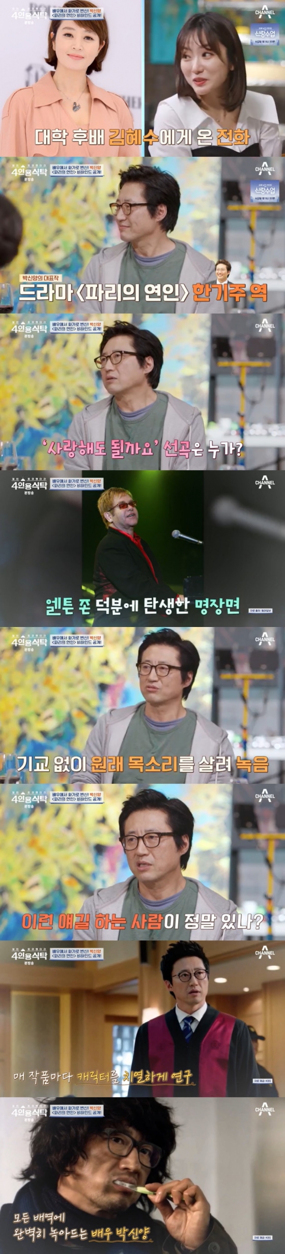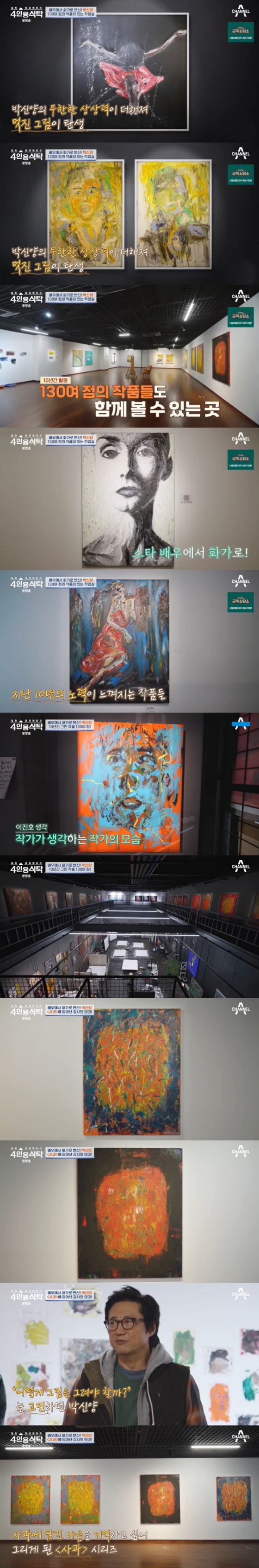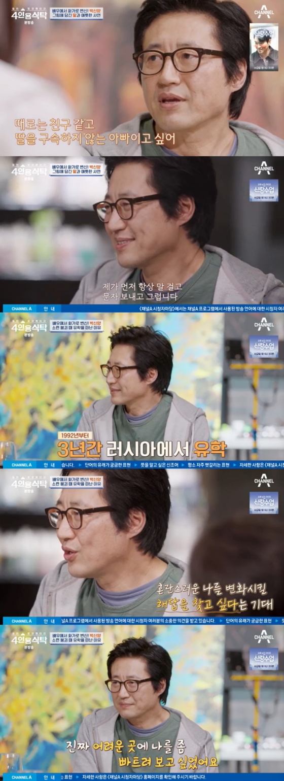 1일 방송된 채널A '절친 토큐멘터리 4인용식탁'(이하 '4인용식탁')에서는 박신양이 등장했다. 박신양은 한동안 연기생활을 쉬고 10년 동안 130작품을 그려왔고 최근 '제 4의 벽'이란 제목으로 전시회를 열었다. 이날 방송은 그의 전시회장에서 이뤄졌다.