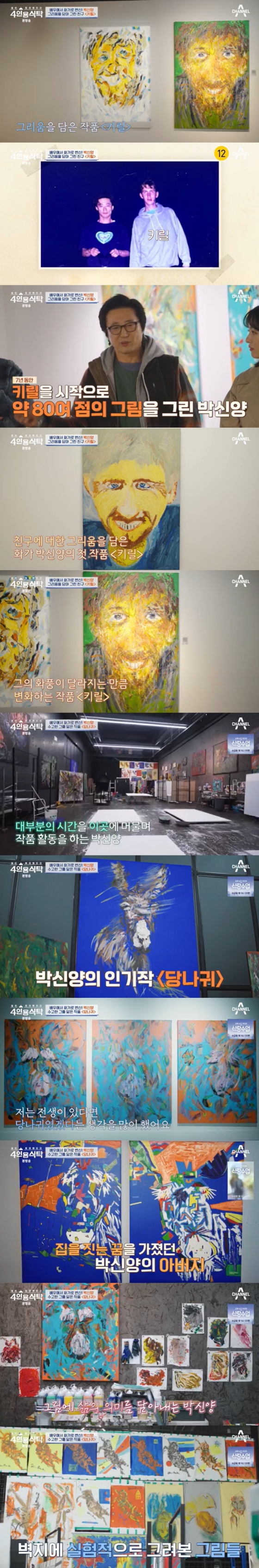 박신양은 러시아 유학 시절 만난 친구 키릴을 그리워하며 그림을 그리기도. 그는 "3년 동안 80점을 그렸다"라고 밝혔다. 박신양은 '당나귀' 그림을 보여주며 "저는 전생이 있다면 당나귀였겠다는 생각을 많이 했다. 의미 있는 짐, 가치 있는 짐이 뭔지를 생각하는 자신을 보면서 그런 생각을 했다"며 "아버지가 집을 짓는 꿈을 오랫동안 꾸셨다. 무가치한 꿈을 수 있지만 아버지를 지탱한 꿈이었다"라고 전했다.