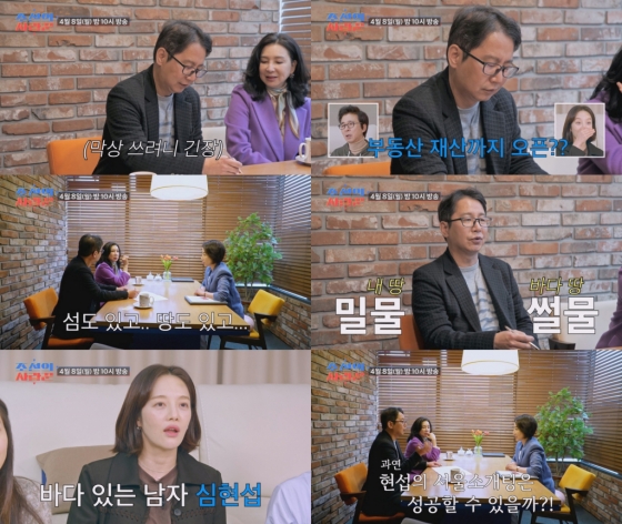 상담사는 심현섭에게 "부동산 재산은 어느 정도인지 대략적으로 작성해달라"고 부탁했고, 이를 지켜보던 황보라는 "너무 디테일하다"라며 깜짝 놀랐다. 심현섭이 생각에 빠지자 심혜진은 "제가 봤을 때는 최하 OO억 정도 된다. 섬도 있고 땅도 있으니까"라고 전해 궁금증을 자아냈다. 그러나 심현섭은 "땅이 있긴 한데 밀물 때 내 땅이고 썰물 때 없어진다"라며 머쓱해했다.