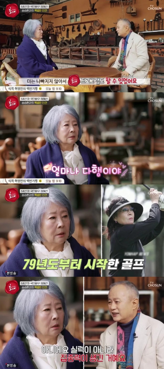 송승환은 "한 10년 동안 선생님이랑 골프 모임에서 만났다"고 했고, 정혜선은 "내가 (골프를) 79년도부터 시작했으니까 40년 동안 했다. 인생의 반 동안 공을 쳤다는 이야기다. 사람이 집중력이 있으면 모든 게 다 잘 될 수 있다"고 전했다.