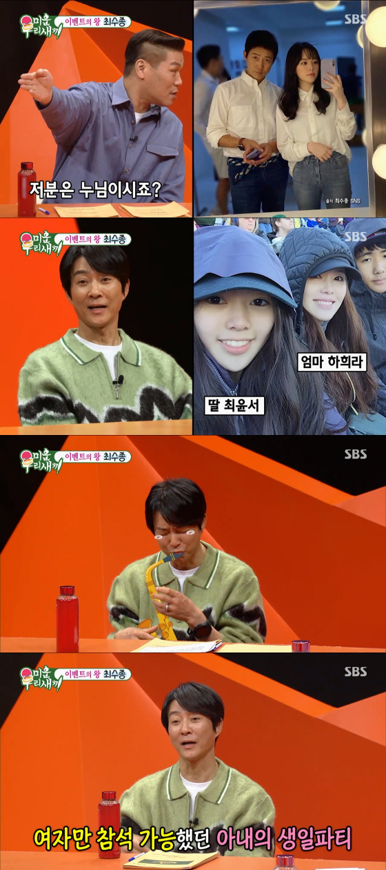 이날 '미우새'에 스페셜 MC로 출연한 최수종의 아내 하희라와 똑 닮은 딸의 외모가 공개되어 모두의 감탄을 자아냈다. '이벤트의 황제' 최수종은 "딸의 결혼식 때 아빠들이 이벤트를 하는데, (딸에게) 아빠가 색소폰 멋있게 연주해 주겠다고 했다"라고 밝혔다. 이어 최수종은 "하희라 씨가 '그런 거 하지 마라, 울면서 색소폰 뿌-뿌 하면 얼마나 웃기겠냐'라고 하더라"라고 이야기해 폭소를 자아냈다.