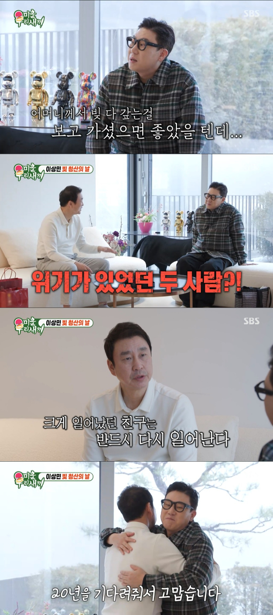 이야기를 듣던 채권자는 "그때 눈매와 죽일 것 같은 기세가… 내가 이제 상민이랑은 끝이구나 (생각했다)"라고 맞장구쳤다. 채권자는 이어 "내가 여기서 화를 내면 안되겠구나. 크게 일어났던 친구는 반드시 다시 일어난다, 기다리자고 생각을 했다"라고 말해 상민을 다시 한번 감동시켰다. 상민은 채권자가 준비해 준 채무 증서를 찢어버리며 감개무량한 모습을 보였다. 상민은 빚을 청산한 기념으로 은행을 찾아 50년 만에 주택청약통장을 만들었고, 이 장면은 최고 14.3%까지 올라 '최고의 1분'을 기록했다.
