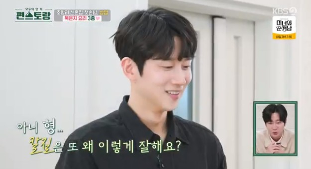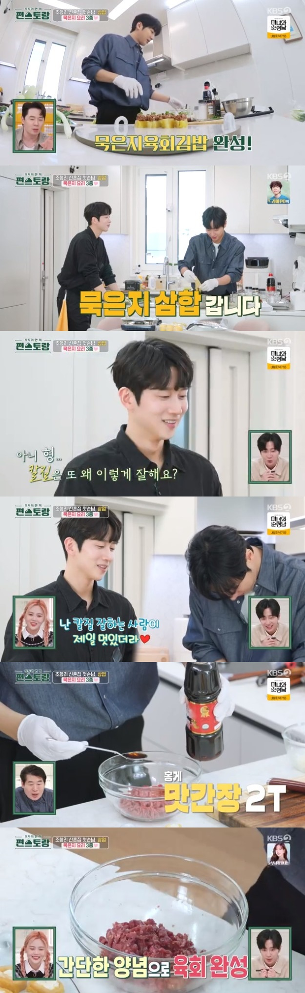 이어서 깻잎막회와 묵은지 삼합을 만들었다. 깻잎을 잘게 썰어 회와 섞고 홍게 간장, 참기름, 깨소금으로 간을 했다. 요리에 집중하는 이상엽을 빤히 바라보던 조항리 아나운서는 "형(이상엽)이 해서 그런지 요리가 멋있다" "요리가 형 닮아서 잘생겼다"라며 플러팅했다.