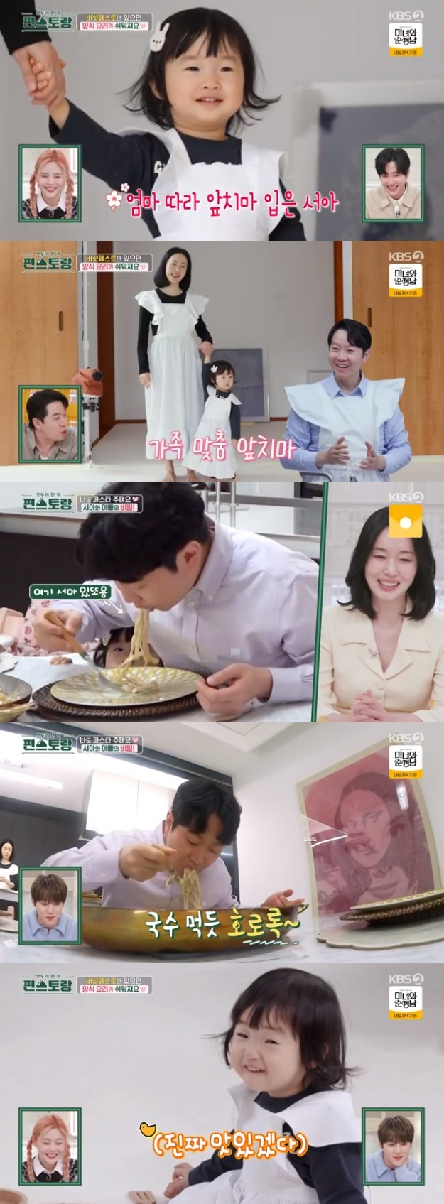 무엇보다 눈길을 끈 건 새하얀 프릴 앞치마로 맞춰 입은 이정현과 서아 양이었다. 이 앞치마는 앞선 방송에서 이정현 남편이 아내 요리를 도와줄 때 입어 웃음을 줬던 것과 같은 디자인. 커플 앞치마를 입은 이정현과 서아를 보며 '편스토랑' 식구들은 "귀여워"를 연발했다.