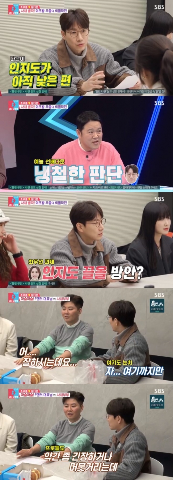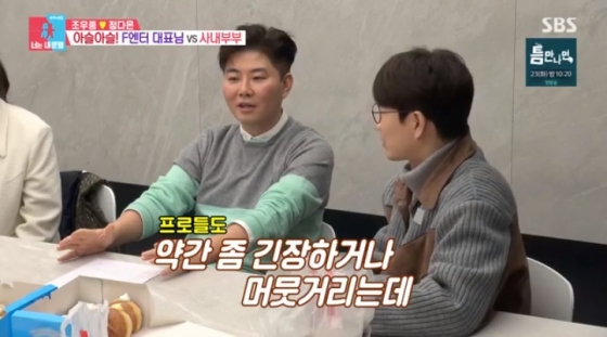 회의가 한창인 가운데 FNC엔터테인먼트의 수장 한성호 대표가 회의실을 찾았다. 조우종 정다은 부부와 직원들을 위한 간식을 들고 온 한성호 대표는 "사실 (조)우종이가 한다고 했으면 안 왔을 텐데 다은 씨가 왔다고 해서 왔다"고 말했다.