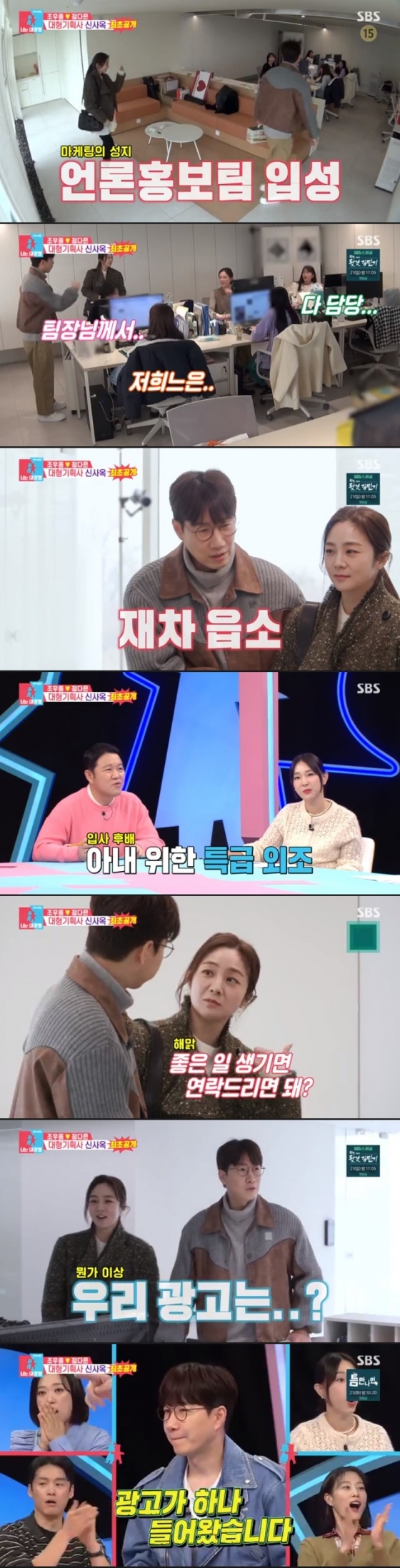 이날 방송에서는 최근 FNC엔터테인먼트와 전속 계약을 체결하고 한솥밥을 먹게 된 정다은을 위해 소속사 식구들을 동원한 조우종의 모습이 그려졌다. 조우종은 정다은과 함께 소속사를 찾아 직원들과 소통하며 아내의 본격적인 활동을 적극적으로 응원했다.