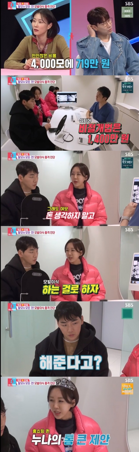 모발 이식 선배인 한영은 남편에게 모발 이식 수술을 권했다. 실제로 성형외과를 찾아 본격적인 모발 이식 검사와 상담을 받은 두 사람. 전문의가 추천하는 수술법의 견적은 최고 700만원에서 최대 1400만원까지의 거액이었다.