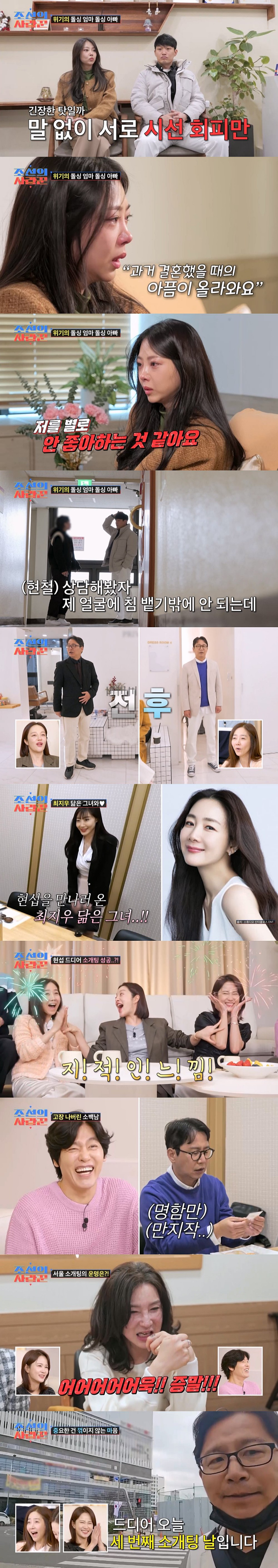 15일 방송된 '조선의 사랑꾼'에서는 '돌싱커플' 유현철♥김슬기가 부부상담을 받았다. 서로 다른 성향 때문에 다툰 두 사람은 상담가에게 조심스럽게 불화를 털어놨다. 하지만 김슬기는 눈물을 흘리며 "혼자 개인적으로 이야기하면 안 되냐. 같이 있으니 솔직히 다 이야기하기 어렵다"며 유현철을 내보냈다. 제작진과 함께 밖으로 나간 유현철은 "어제 싸웠다. 감정적으로 나오니까 제대로 상담을 못 하겠다"며 착잡한 심경을 드러냈다.