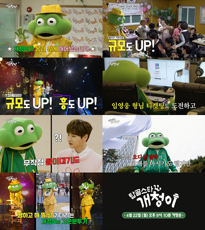 탑골스타를 꿈꾸는 우주 최초 개구리 가수 '개청이'의 휴먼 다큐 '탑골스타 개청이'는 매주 월요일 저녁 6시 유튜브 '탑골스타 개청이' 채널에 선공개 되고, 이어 저녁 8시 10분 EBS 1TV을 통해 방송된다.