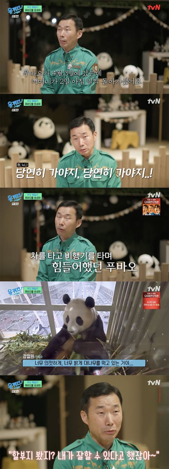 이어진 장면에서는 강철원 사육사의 인터뷰가 이어졌다. 그는 "푸바오가 4월 3일에 갔는데 어머니가 4월 2일 날 아침 일찍 돌아가셨다. 31일에 마지막으로 아내와 어머니를 뵀다. '중국에 잘 다녀오겠다'라고 했더니 '큰일 하느라 고생한다'라고 하셨다"라며 당시를 회상했다.