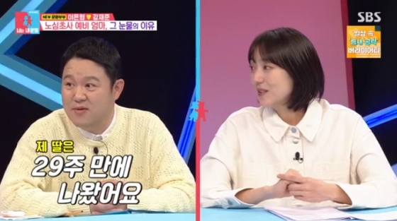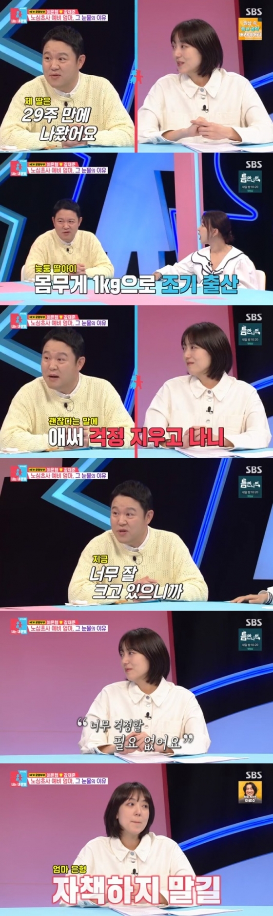 이에 김구라는 "자책하지 않아도 된다. 나도 늦둥이 딸이 29주에 태어났다. 1kg으로 작게 태어나서 걱정을 했었는데 의사가 걱정 안해도 된다고 하더라. 다행히 잘 크고 있다"고 말하며 이은형을 위로했다.
