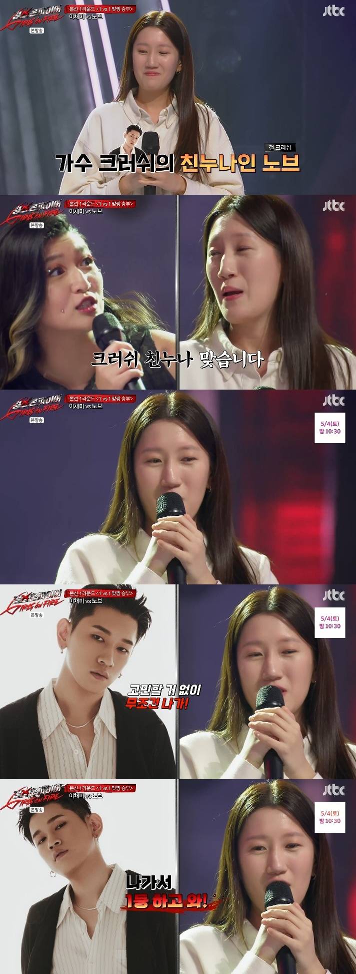 이채미와 대결을 겨루게 된 도전자는 노브였다. 부끄러운 듯한 표정과 말투로 조심스럽게 입을 연 그녀는 "가수 크러쉬의 친 누나다"라고 자신을 소개했다. 모두가 놀란 표정을 감추지 못한 가운데 노브는 "동생한테 말했더니 무조건 나가서 1등 하고 오라고 하더라"라고 말했다.