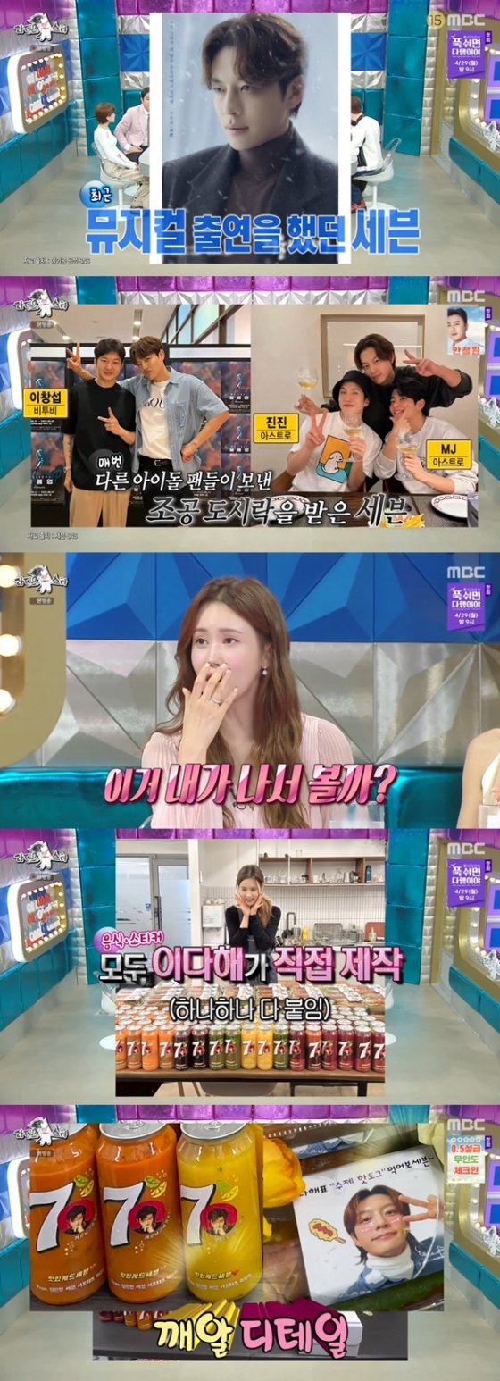 이다해는 세븐의 공연에도 서포트했던 일화를 밝혔다. 그는 "(세븐이) 이번에 '겨울 나그네'라는 뮤지컬을 했다. '자기야 오늘 뭐 먹었어?' 물으면 (세븐이) '창섭이 팬들이 조공해 준 거 먹었어', '아스트로 팬들이 조공해 준 거 먹었어'라고 하더라. 저는 횟수에서 밀리는 게 좀 그래서 '이거 내가 나서볼까?' 생각했다"라고 말했다.