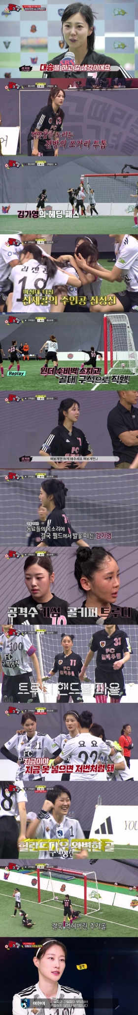 초반 '구척장신'은 부상 여파가 있는 에이스 허경희를 교체 멤버로 시작해 좀처럼 공격 활로를 뚫지 못했다. 그사이 '원더우먼'은 김가영과 소유미의 '쏘가리 투톱'을 전방에 앞세워 공격을 몰아붙였고, 계속해서 유효슈팅을 만들어내며 '구척장신'을 위협했다. '원더우먼'의 기세에 밀리자 중요한 타이밍으로 판단한 하석주 감독은 허경희를 투입해 분위기 반등을 노렸다.