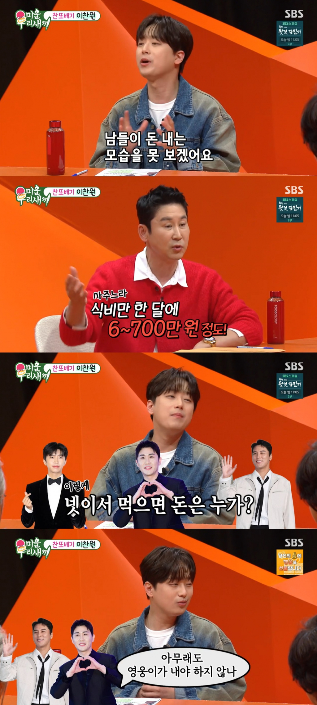 이찬원은 "누가 계산하는 꼴을 못 본다"면서 "지인 중 좋은 일이 있으면 선물하고 맛있는 거 먹이는 걸 좋아한다. 남들이 돈 내는 걸 못 보겠다. 식비가 진짜 많이 나올 땐 한 달에 600~700만원 정도 나온다"고 밝혀 모벤져스를 깜짝 놀라게 만들었다.