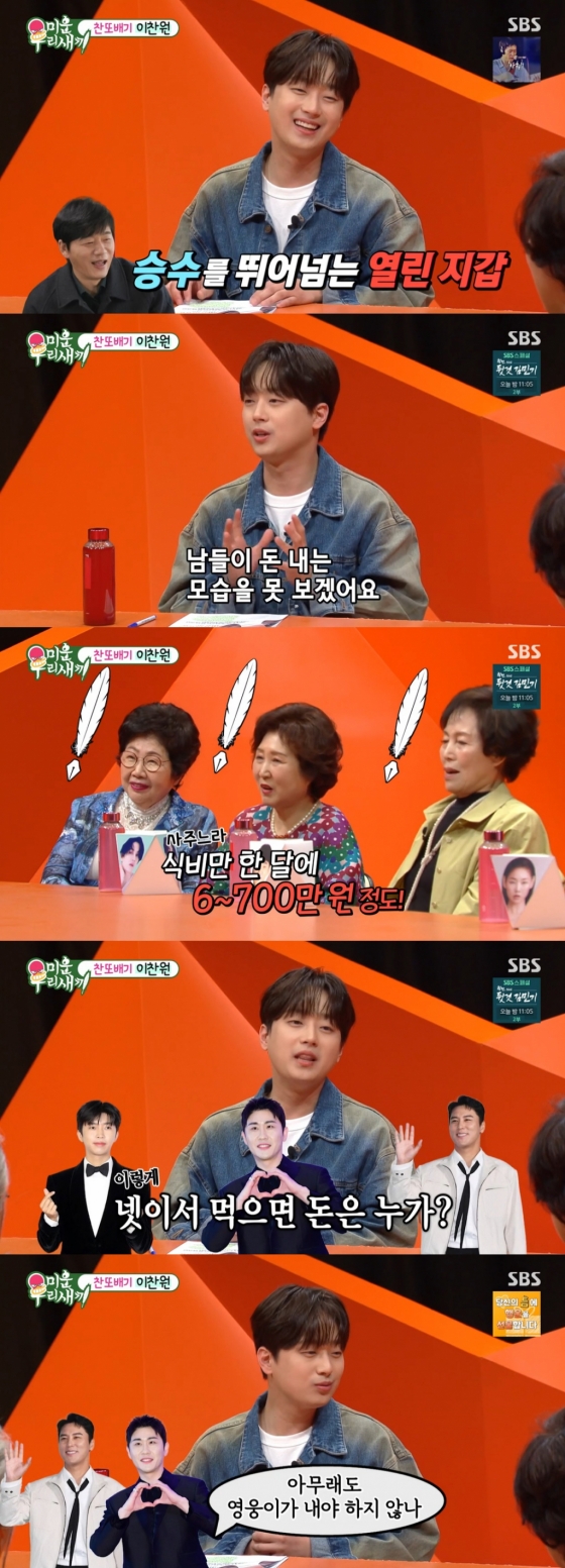 '미우새' 서장훈은 모든 게 완벽한 이찬원에게도 치명적인 단점이 하나 있다고 털어놨다. 그것은 바로 김승수를 뛰어넘는 열린 지갑이라고. 이찬원은 "누가 계산하는 꼴을 못 본다"면서 "지인 중 좋은 일이 있으면 선물하고 맛있는 거 먹이는 걸 좋아한다. 남들이 돈 내는 걸 못 보겠다. 식비가 진짜 많이 나올 땐 한 달에 600~700만원 정도 나온다"고 밝혀 모벤져스를 깜짝 놀라게 만들었다.