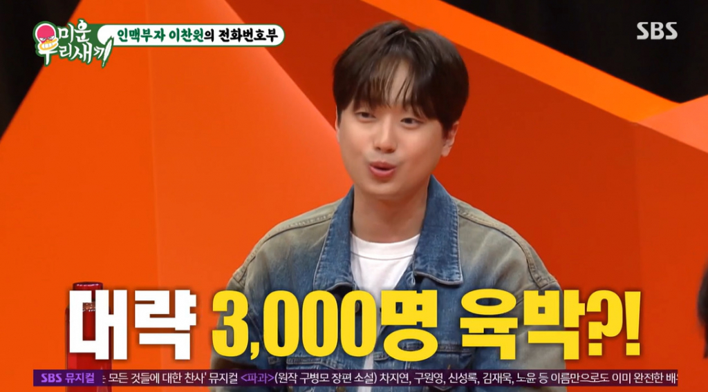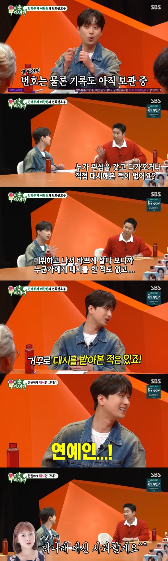 아찬원이 '연예계 마당발'의 면모를 자랑하기도 했다. 휴대폰에 저장된 전화번호만 2500개 된다고. 이찬원은 "다 여자는 아니다. 촬영장에 오기 전 정확하게 확인해 보니까 약 3000명 정도 된다. 옛 연인 번호도 그대로 간직하고 있다. 예전 여자친구랑 교제할 때 남겼던 연락 기록들도 그대로 남아있다. 그때 나의 내 모습도 추억이라고 생각한다"라고 밝혔다.
