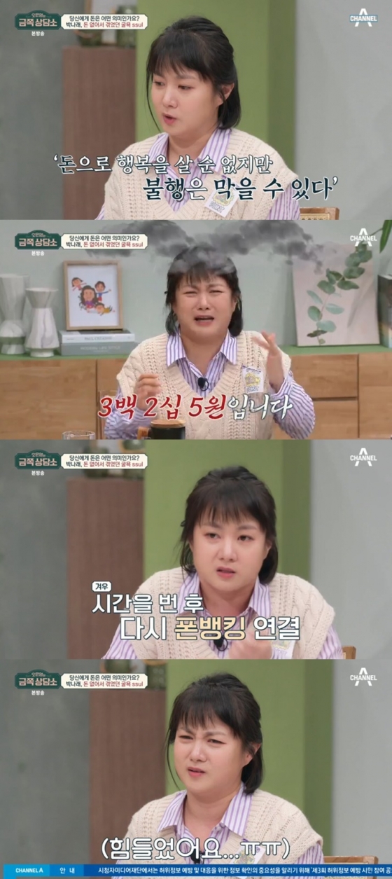 박나래는 과거 제작사에 '출연료가 언제 들어오냐'고 물었더니 '오늘 들어갈 거다'라고 해서 친구들과 식사 약속을 잡았는데 돈이 들어오지 않았다고. 당시 폰 뱅킹을 하던 시절이었다는 박나래는 "조용히 화장실에 가서 전화를 걸었는데 (잔액이) 325원 밖에 없더라"며 결국 친구들과 대화를 나누며 30분 정도 시간을 번 후에야 120만 원이 입금된 걸 확인하고 안심이 됐다고 털어놨다. 이어 박나래는 "밥 먹으러 갈 때 (이제) 가격 생각 안하고 내니까 '이게 기쁨이구나, 내가 불행하지 않구나' 생각이 들었다"고 덧붙였다.