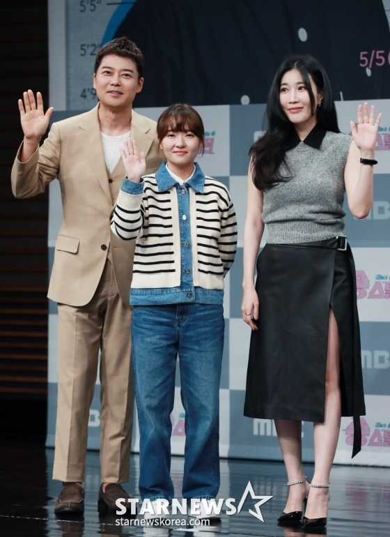 전현무, 장하린 PD, 이해리가 3일 오전 서울 마포구 상암동 MBC에서 진행된 예능 '송스틸러' 제작발표회에 참석해 포즈를 취하고 있다.