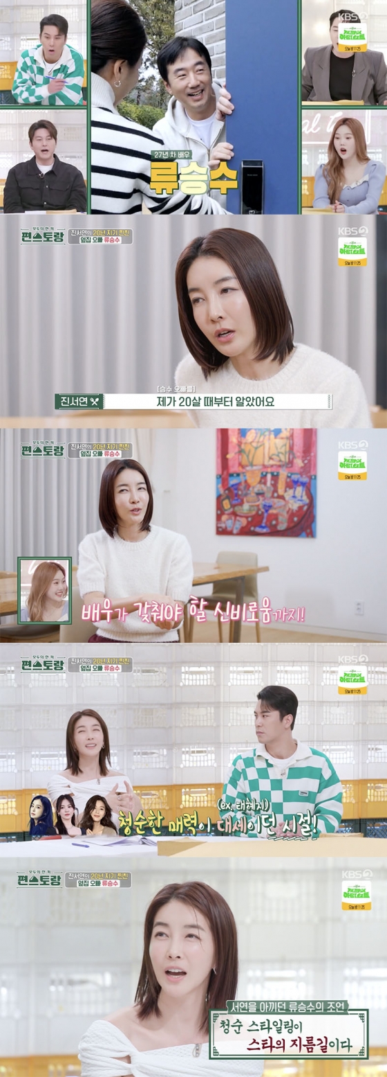 이날 진서연은 류승수와 20살 때부터 알고 지낸 20년 지기라고 소개했다. 그러면서 "어렸을 때는 제 연기 지도도 해주고 조언도 해줬다. 여배우의 태도, 행실, 신비로움까지 알려줬다"라고 덧붙였다.