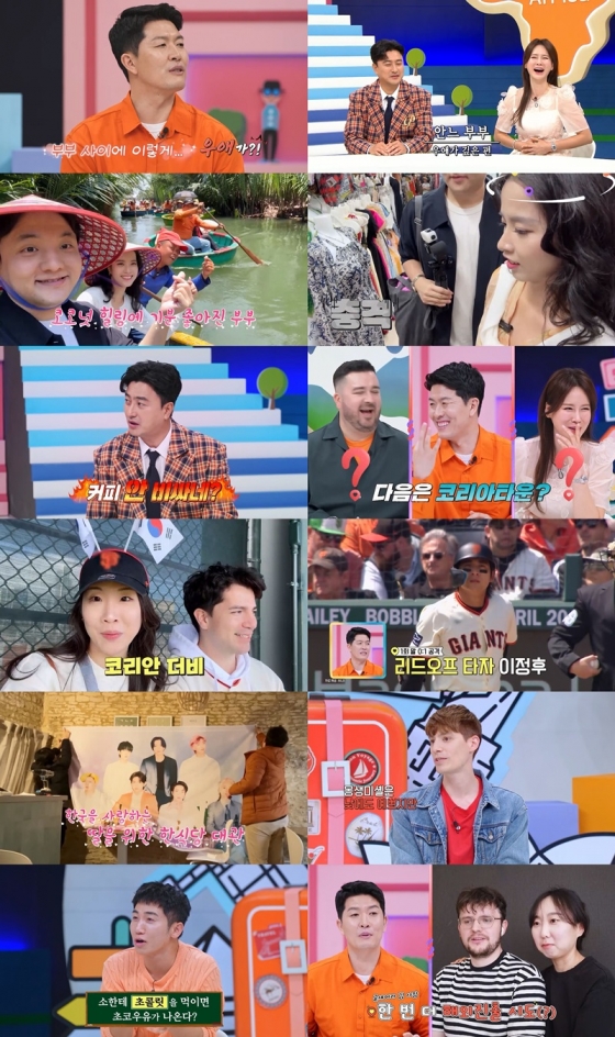 '찐친 바이브'가 스튜디오를 달군 가운데, 베트남 호찌민에서 신혼 생활 중인 유찬X코이 부부의 다낭 여행기가 먼저 펼쳐졌다. 두 사람은 용다리와 바나힐, 미케비치 등 다낭의 명소들을 차례로 소개했으며, 호이안 코코넛 마을의 명물인 틴퉁(바구니 배) 체험에 나섰다. 특히 강 길목에서 싸이의 '강남스타일'에 맞춰 틴퉁 회오리쇼가 펼쳐지자, 스튜디오 출연진 모두가 놀라 입을 떡 벌렸다. 여기에 재래시장에서도 상인들이 한국어로 능숙하게 흥정을 하고, 마사지숍에서도 자연스러운 한국어 서비스가 제공되자, 샘 해밍턴은 "한국인이 사랑하는 관광지여서 '경기도 다낭시'로 불릴 정도"라고 설명해 폭풍 공감을 자아냈다.
