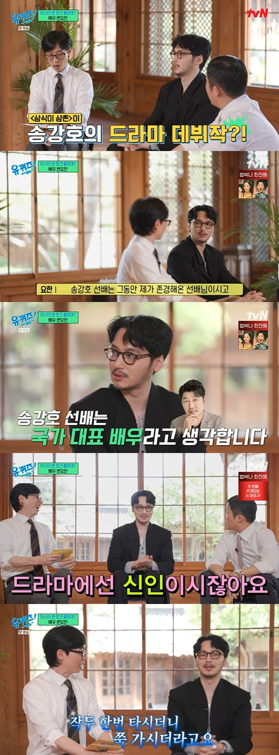 이에 변요한은 "'삼식이 삼촌'은 송강호 선배님의 드라마 데뷔작"이라고 소개하며 "송강호는 그동안 제가 존경하던 선배님이고 대한민국 국가대표 배우라고 생각한다. 근데 이제 드라마 경험이 없으시다 보니, 신인이시지 않나. 제게 많이 의지를 하시더라"라고 너스레를 떨었다.