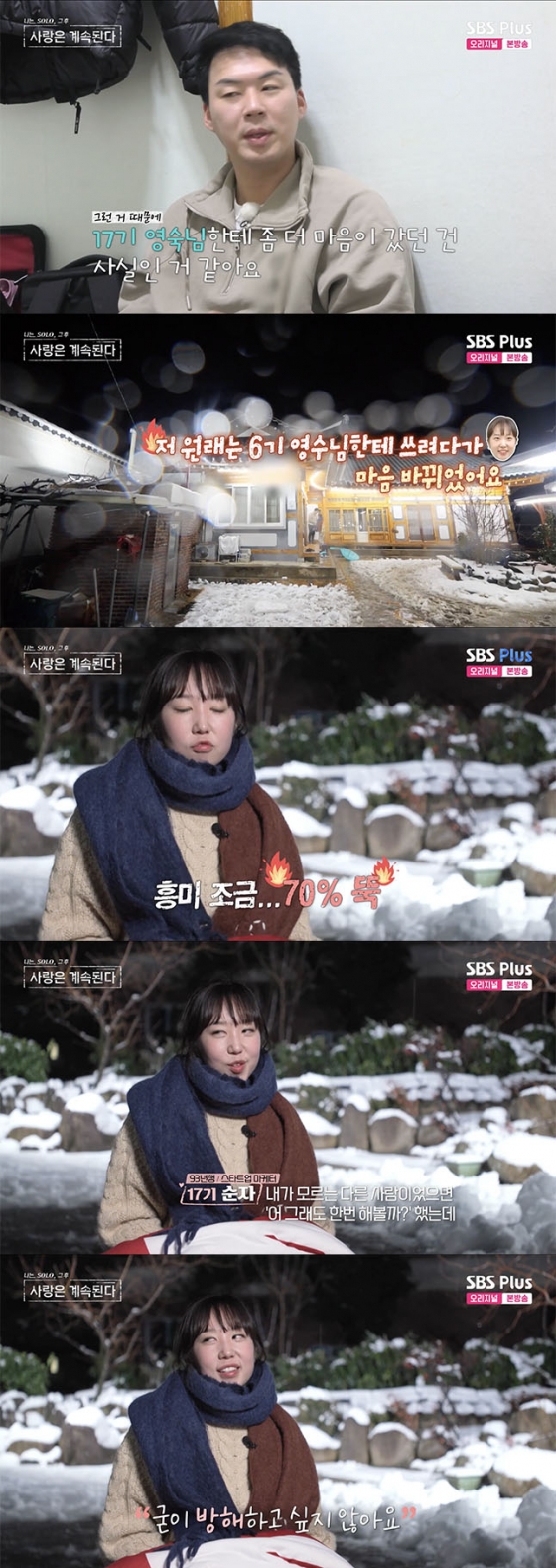 16일 오후 방송된 SBS플러스, ENA의 예능 프로그램 '나는 SOLO, 그 후 사랑은 계속된다'에서는 17기 순자와 6기 영수의 대화 장면이 그려졌다.