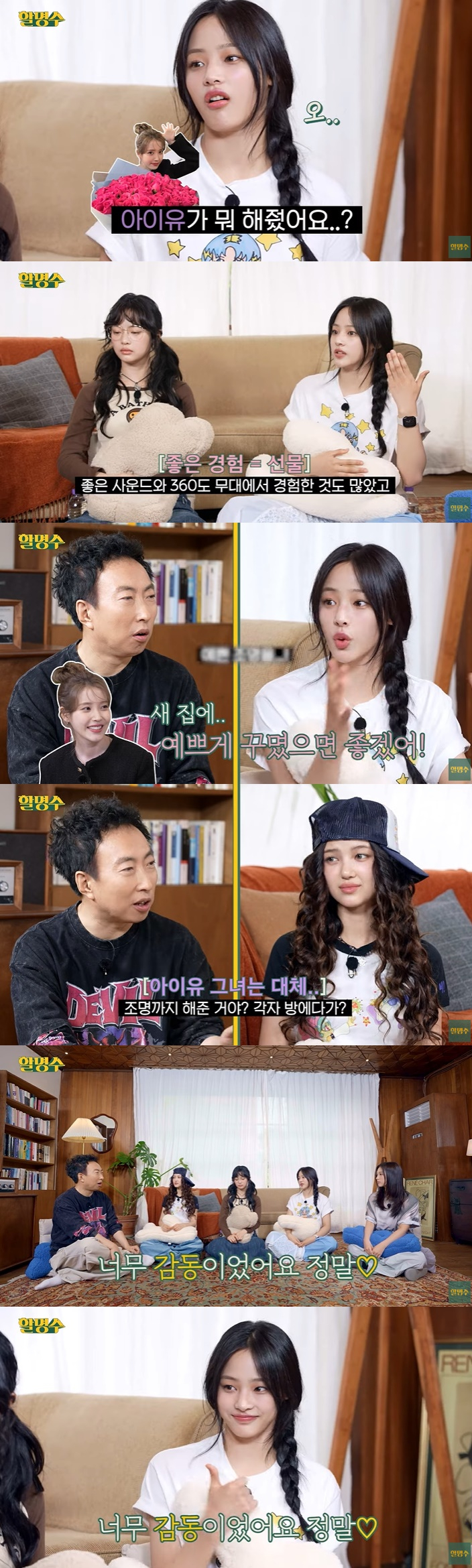 민지는 이어 "저희가 최근에 이사를 했는데 (아이유가) '예쁘게 꾸몄으면 좋겠다'며 되게 예쁜 조명을 다 준비해 주셨다. 편지도 써주셔서 너무 감동이었다"고 말했다.
