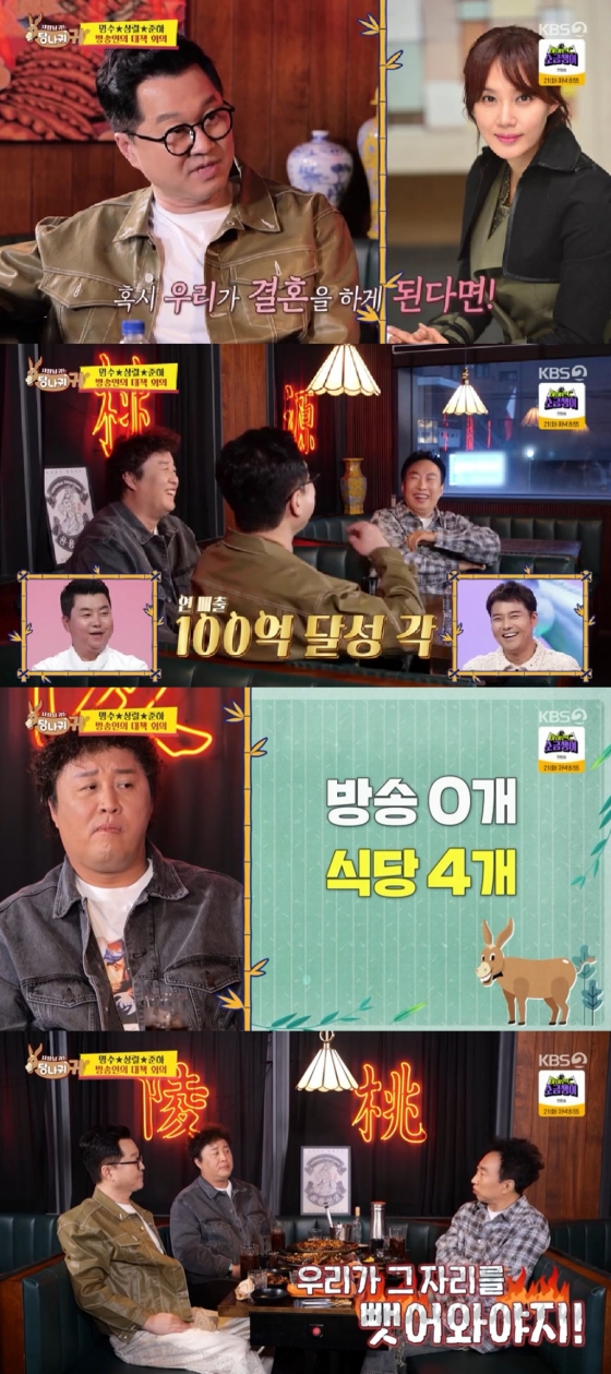 19일 방송된 KBS 2TV 예능프로그램 '사장님 귀는 당나귀 귀'(이하 '사당귀')에는 박명수가 절친한 지상렬, 정준하와 만나 대책 회의를 열었다.