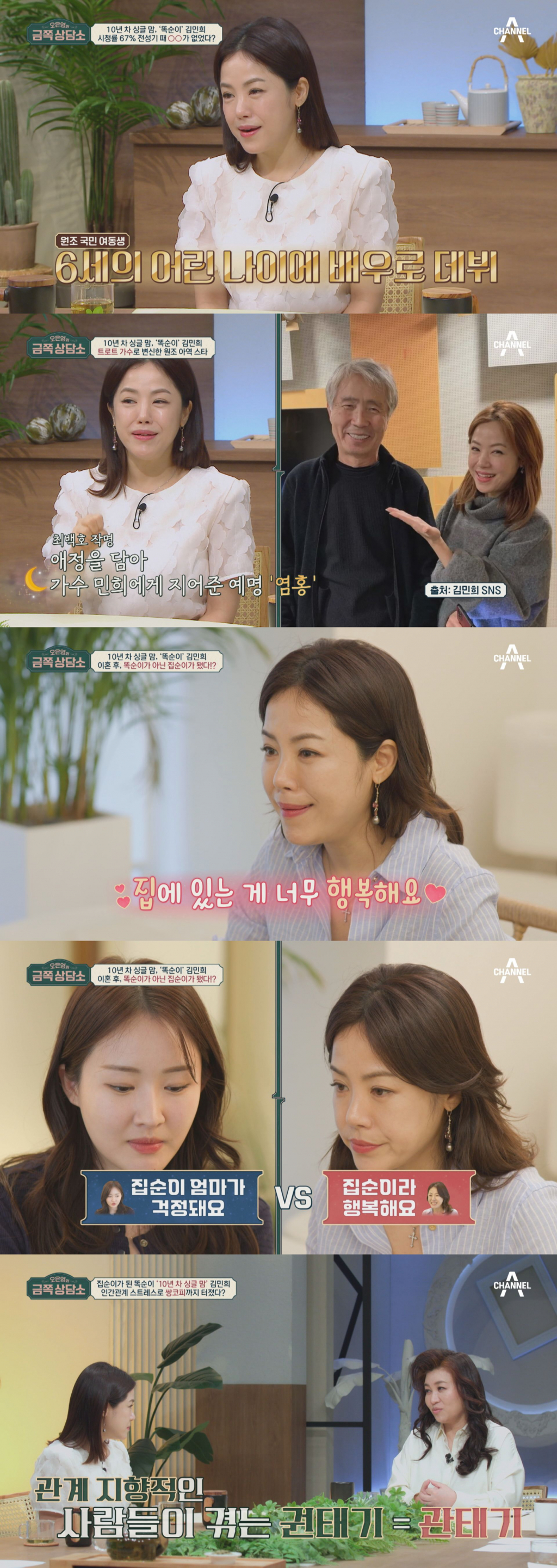 23일 오후 8시 10분 방송 예정인 채널A '오은영의 금쪽 상담소'에는 원조 국민 여동생 '똑순이' 김민희, 서지우 모녀가 방문한다. 김민희는 무려 시청률 67%를 기록한 드라마 '달동네'에서 '똑순이'로 데뷔 후 원조 아역스타로 대중들의 많은 사랑을 받은 것에 이어 최근에는 트로트 가수 '염홍'으로 데뷔해 제2의 인생을 시작했다.