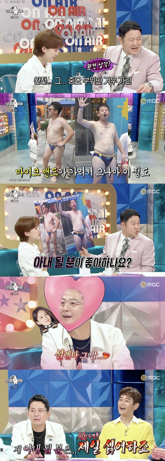 김구라는 다시 사진을 유심히 보며 "사람이 너무 짧아 보인다. 네 살짜리 같다. 아내 될 분 갖다 줘라"라며 판넬 사진을 김준호에 선물로 건넸다.