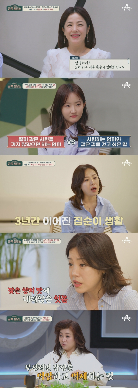 이에 오은영 박사는 김민희의 상담에 대해 "엄마가 아닌, 연기자 선배로서의 조언만 해주었다"라고 지적하며 "자녀들은 엄마만이 해줄 수 있는 이야기를 듣고 싶을 것"이라며 딸 서지우의 마음을 헤아린다. 하지만 오은영 박사는 김민희의 모습에서 배우 활동의 고됨을 강조하는 모습을 포착했다며 배우를 그만두고 싶었던 적이 있었는지에 대해 질문한다. 김민희는 "어렸을 때부터 추워, 배고파, 안 할래 같은 말을 진작에 해야 했다"라며 힘들었던 아역 시절을 회상한다. 초등학교 6학년 무렵 영화 '오싱' 촬영 당시, 한겨울 강원도 혹한의 날씨에도 "진짜 눈을 얼굴에 묻혀가며 촬영했고 밤새 아무것도 먹지 못하거나 장염에 걸려 아파도 후시 녹음을 해야 했다"라고 고백해 그 당시 '아역배우 잔혹사'라 할 만한 경험들을 털어놓는다. 이어 어려움을 버텨가며 월 200만 원의 수입이 있었지만 아버지가 정치활동을 위해 쓴 어음 때문에 빚이 많았고 초등학교 3학년 때 아버지를 여의고 소녀 가장이 되어야 했던 가슴 아픈 사연을 고백해 안타까움을 자아낸다.