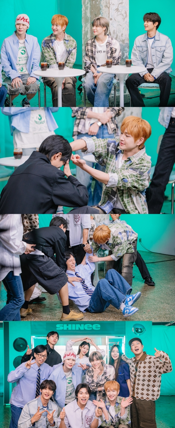 공개된 사진 속에는 '놀면 뭐하니?' 멤버들과 만난 샤이니 온유, 키, 민호, 태민의 모습이 포착돼 눈길을 끈다. 특히 온유는 오랜만의 예능 출연이 어색해 적응에 진땀을 흘리는 모습으로 모두의 집중 관심을 받는다.