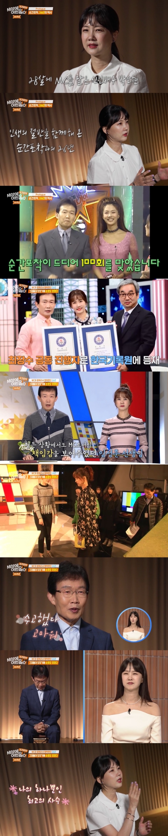 임성훈은 오프닝에서 "오늘은 저희 '순간포착 세상에 이런 일이'가 26주년을 맞이하는 날이자 저희 MC 넷이 하는 마지막 방송이다"라고 했고, 박소현은 "제 인생의 절반을 '순간포착'과 함께 했다. 가족을 제외하고 이렇게 오랫동안, 매주 일주일에 한번씩 뵌 분이시다"라며 임성훈을 가리켰다.