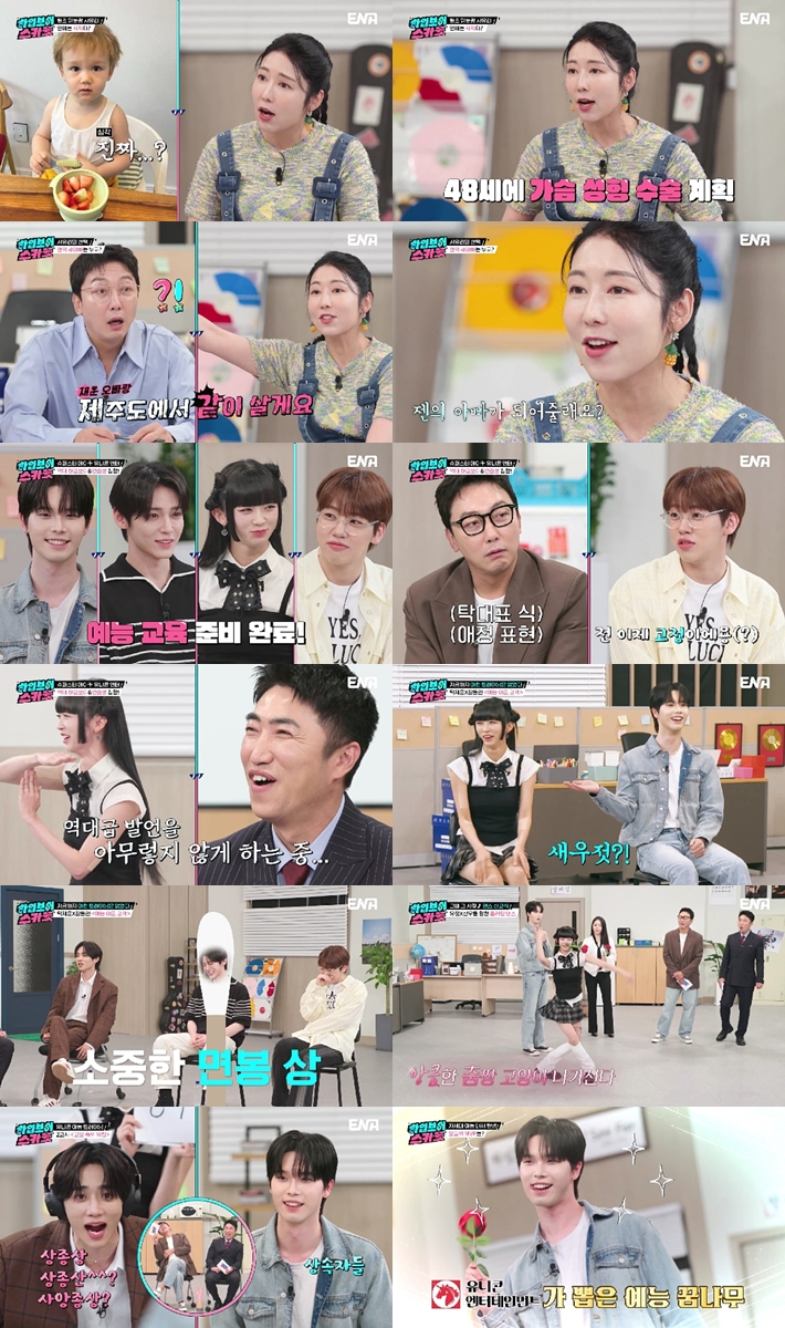 그런가 하면, 탁재훈은 "오늘은 유니콘 엔터 '중간점검의 날'이다. 그동안 유니콘 엔터 소속의 '하입보이'가 자신의 끼와 재능을 선보일 것"이라고 '유니콘 예능 학교'의 오픈을 알렸다. 잠시 후, '제1대 하입보이' 송형석을 필두로, '제4대 하입보이' 차웅기, 'SNS계 차은우' 전창하, 'MZ 챌린지 안무 공장장' 레디가 등장했다. '예능 강사진'으로 나선 탁재훈 장동민은 먼저, "상대방을 생선에 비유해보라"며 예능 즉흥력 테스트를 시작했다. 이때 송형석은 레디에게 "약간 새우젓?"이라더니, 전창하를 향해서는 "생선보다는 소중한 면봉?"이라고 막 던져 모두를 빵 터지게 만들었다. 그의 엉뚱한 드립력에 탁재훈은 "우리가 (하입보이를) 잘 뽑았다"며 만족스러워했다.