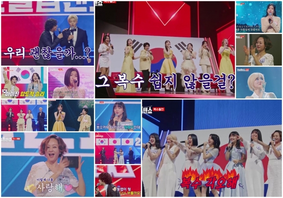 이날 방송에서는 MC 첫 도전에 나서는 대성과 강남이 우렁찬 목소리와 함께 무대 위로 등장, 열기를 끌어올렸다. 두 사람은 "양국의 넘쳐나는 명곡들이 많다. 이런 말도 안 되는 뜻깊은 프로그램에 저희 둘이 MC인 게 말이 되나요"라는 말로 폭소를 터트리며 앞으로의 찰떡 티키타카 호흡을 예고했다. 이어 첫 번째 명곡전쟁에 출사표를 던질 한일 가수로 '현역가왕' TOP7이 '날 봐 귀순'을, '트롯걸즈인재팬' TOP7이 '긴기라기니 사리게나쿠'를 부르며 나타나 흥을 돋웠고, 일본 TOP7은 그사이 유창해진 한국말로 인사를 건네 환호성을 일으켰다.